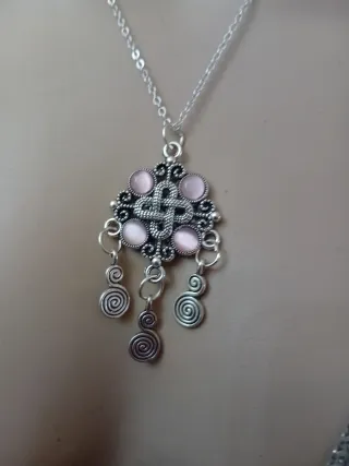 Collana con un ciondolo decorato con pietre color rosa e dettagli in argento. - Ciondolo con motivo celtico. - Inserti in opale rosa. - Pendenti a spirale. - Catena in metallo argentato.