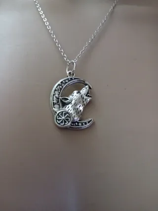Collana con ciondolo a forma di luna con lupo ululante e simbolo solare. - Design ispirato alla cultura vichinga. - Dettagli intricati sulla luna e sul lupo. - Simbolo solare al centro.