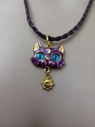 Collana con ciondolo a forma di gatto stilizzato e un piccolo sole pendente. - Ciondolo gatto con dettagli color viola e oro. - Occhi del gatto blu. - Ciondolo a forma di sole dorato.