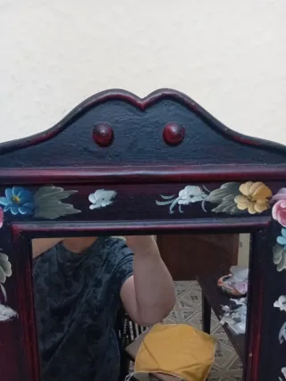 Bellissimo specchio con cornice in legno scuro, finemente decorato a mano con motivi floreali. - Decorazioni floreali dipinte a mano. - Cornice in legno scuro. - Design unico e artigianale.