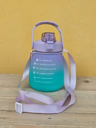 Borraccia graduata per monitorare l'assunzione di acqua durante la giornata. Presenta una scala oraria per aiutarti a bere regolarmente. - Capacità: 2 litri - Colore sfumato viola/verde acqua - Tracolla regolabile e manico - Con cannuccia - Con chiusura di sicurezza (scorrendo in alto la chiusura si blocca, scorrendo in basso è pronta per l'apertura) 📌 Mai usata