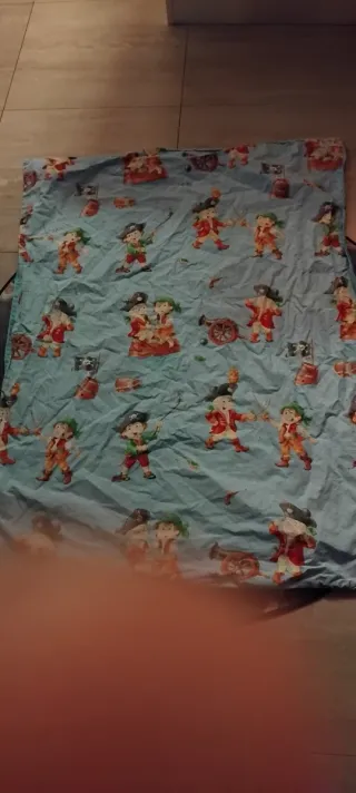 Set copripiumino per lettino con simpatico disegno a tema pirati. Include anche la federa e il sotto con angoli blu - Fantasia con due bambini pirati e un pappagallo. - Colori vivaci su sfondo azzurro. - Federa coordinata inclusa. - lenzuolo con angoli blu