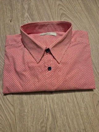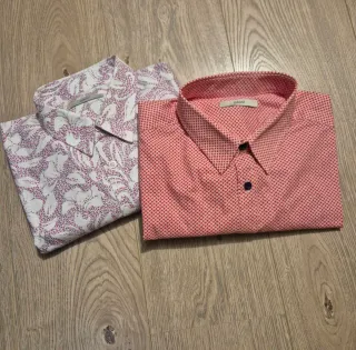 Due camicie da uomo con fantasia. - Una camicia a fantasia geometrica rossa e bianca. - Una camicia a fantasia floreale bianca e rosa acceso.Entrambe perfette in quanto usate solo a una cerimonia.Vendo per errata taglia,è una L ma veste slim,ideale per una M,48. 25 l'una,40 per entrambe.Pagate circa 50 l'una