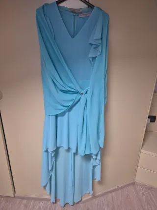 Elegante abito lungo Rinascimento in un bellissimo color verde acqua. Perfetto per occasioni speciali. - Tessuto leggero e fluttuante. - Dettaglio drappeggiato sul davanti. - Orlo asimmetrico.Al ginocchio davanti,lungo dietro.Con stola abbinata.