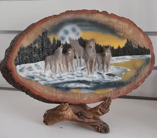 Bellissimo quadro decorativo con una scena di lupi su un tronco di finto legno. Cm 30 circa - Raffigurazione di un branco di lupi in un paesaggio innevato.
