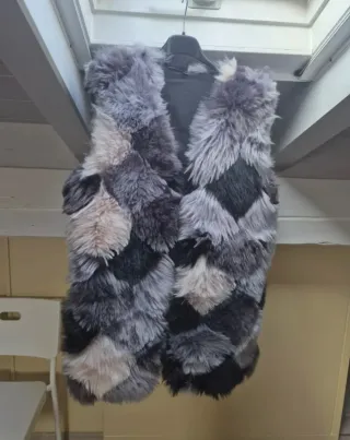 gilet da donna realizzato con un patchwork di pelliccia sintetica in diverse tonalità grigio,nero e panna. - Design patchwork unico. - Morbido al tatto. - Vestibilità comoda.Taglia S italiana.42Chiisura con due gancetti nascosti.PREZZO RIBASSATO