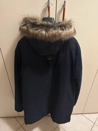 Parka blu con cappuccio bordato in pelliccia sintetica. Un capo caldo e alla moda. - Chiusura con bottoni e zip. - Tasche frontali. - Fodera interna.