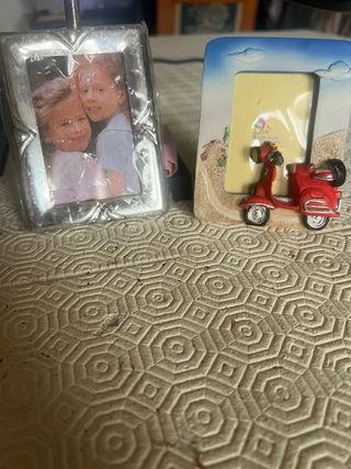 Set di due piccoli portafoto, ideali per conservare i tuoi ricordi più cari. - Dimensioni interne per foto: 10x8 cm. - Un portafoto ha una cornice in metallo argentato con un design classico. - L'altro portafoto è decorato con un simpatico scooter rosso e uno sfondo a tema spiaggia.