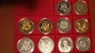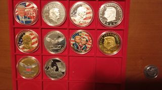 Lotto di 10 monete dollari commemorativi di Donald Trump, coniazioni USA. Le monete sono in FDC (Fior di Conio). - Design con effigie di Donald Trump. - Scritte DONALD TRUMP, PRESIDENT OF THE UNITED STATES, KEEP AMERICA GREAT, SAVE AMERICA AGAIN, 2024, 2023, IN GOD WE TRUST. - Immagini di aquile, bandiera americana e altre figure.