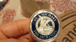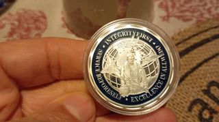 Moneta FDC (First Day Cover) con San Michele. - Placcata argento. - Design con globo terrestre, aerei e figura centrale. - Scritta INTEGRITY FIRST SERVICE BEFORESELF EXCELLENCE IN ALL WE DO sul bordo.