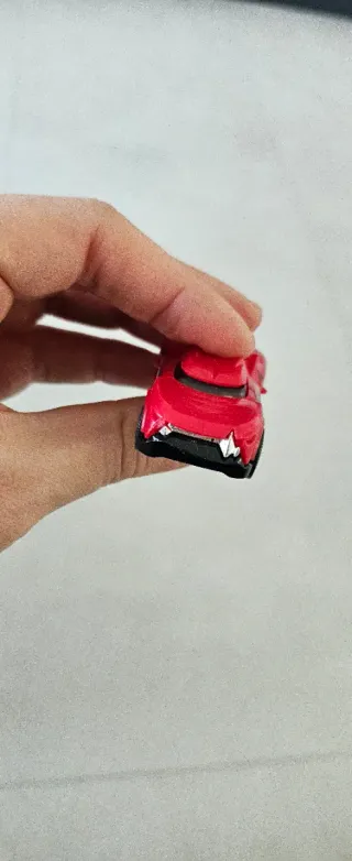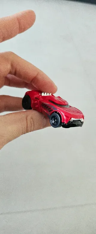 Modellino Hot Wheels Growler di colore rosso. - Design aggressivo con dettagli neri e blu. - Ruote nere. - Dettagli che ricordano denti o artigli.