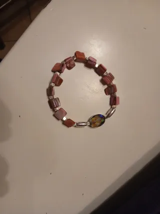 Elegante braccialetto con pietrine colorate. Indossabile con qualsiasi outfit. Bel pensiero di Natale. - Perline squadrate rosa. - Piccole perline cubiche argentate. - Perlina centrale sfaccettata trasparente blu.