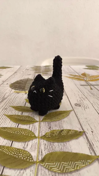Adorabile gatto nero realizzato all'uncinetto in stile amigurumi. Perfetto per gli amanti dei gatti e degli oggetti fatti a mano. - Colore: nero - Materiale: ciniglia - Dettagli: occhi di sicurezza, baffi cuciti in cotone