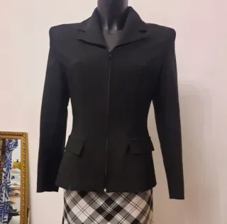 Elegante blazer nero con chiusura a zip. - Corrisponde taglia Italiana 44-46 -Il manichino veste taglia 44-46 - Campione usato solo in sfilata. - Design moderno e versatile. - Tasche frontali applicate. - Collo a revers.