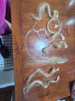 Set di extension per capelli mai usate, con adesivo del quale non garantisco efficacia, ma esistono in commercio appositi adesivi per capelli. Vedi ultime foto misure del capello e di 1 ciocca pettinata - Colore biondo dorato. - Diverse lunghezze e onde. - Facili da applicare. - 6 estensioni