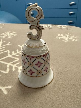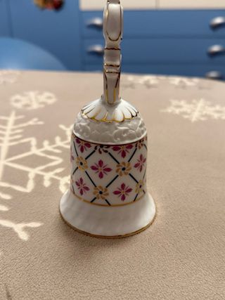 Deliziosa campanella in ceramica, perfetta come oggetto decorativo. - Finitura bianca con dettagli dorati. - Motivo floreale con fiori rosa e quadrati. - Manico decorato con riccioli dorati.