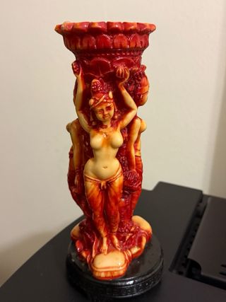 Elegante portacandele in resina con decorazioni orientali. - Raffigurazioni di figure femminili. - Dettagli intricati. - Base scura.