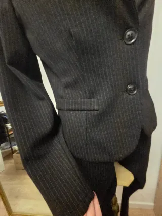 Completo grigio Antracite scuro a righe bianco. Elasticizzato. Pantaloni taglia M Giacca Taglia L Pantalone dritto , 2 tasche laterali e tasche finte dietro.