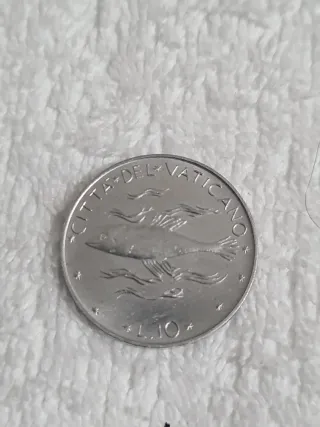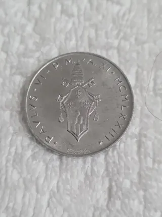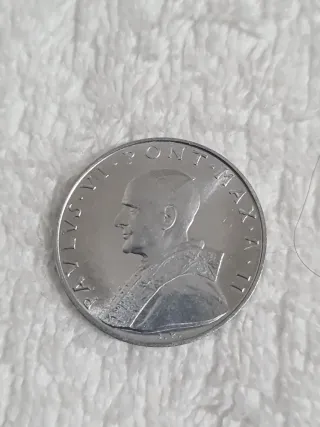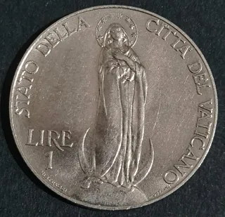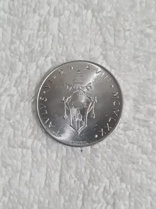 Moneta commemorativa del Vaticano, coniata nel 1975 per il Giubileo. - Diritto: Stemma papale con chiavi decussate e triregno. - Rovescio: AN IVB MCMXLV (Anno IV di Pontificato, 1975). - Zecca: Roma. - Materiale: Alluminio