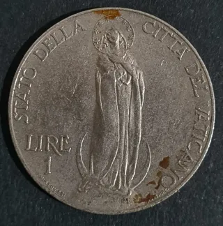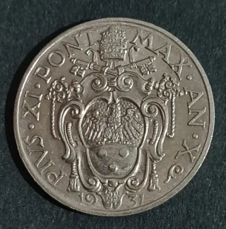 Moneta da 1 Lira del Vaticano, anno 1931, con effigie di Papa Pio XI. - Dritto: Stemma papale con chiavi decussate e triregno. - Rovescio: Papa Pio XI con iscrizione PIVS XI PONT MAX ANNO MCMXXXI.