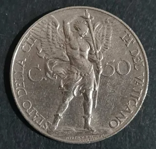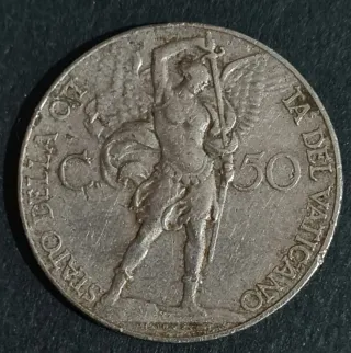 Moneta da 50 centesimi di Lire Vaticane coniata nel 1930. - Diritto: Effigie di Papa Pio XI rivolto verso sinistra, con la scritta PIVS XI PONT MAX AN. - Rovescio: Stemma papale con tiara e chiavi decussate, con la scritta 50 CENTESIMI e l'anno 1930.