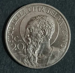 Moneta da 20 centesimi del Vaticano, coniata durante il pontificato di Pio XI nel 1937. - Dritto: Stemma papale con chiavi decussate e triregno. - Rovescio: Scritta Pius XI P.M. AN. X. Pont. 1922-1932 e 20 CENTESIMI V. 1937.