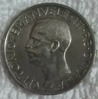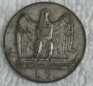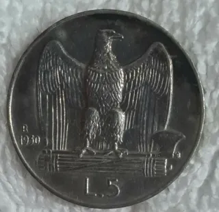 Moneta italiana da 5 Lire del 1930. - Dritto: Aquila sabauda su fascio littorio. - Rovescio: L.5 e R 1930.