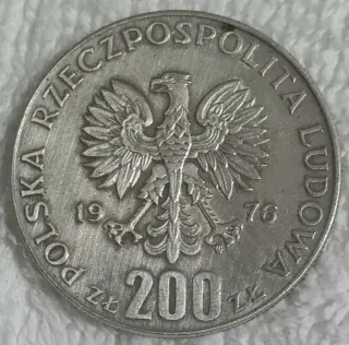 Moneta commemorativa polacca da 200 Zloty del 1976. - Aquila stilizzata, simbolo della Polonia. - Anno di conio: 1976. - Valore nominale: 200 Zloty.