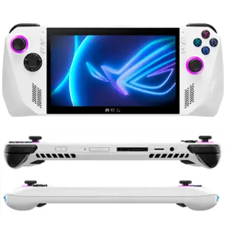 Console portatile Asus ROG Ally in bianco. Design ergonomico con impugnature. Schermo ad alta risoluzione. Controlli integrati.