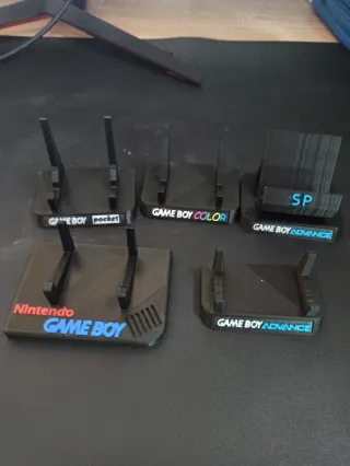 Set di supporti 3D per console Game Boy. - Supporto per Game Boy Pocket. - Supporto per Game Boy Color. - Supporto per Game Boy Advance. - Supporto per Game Boy Advance SP. - Supporto per Game Boy originale.