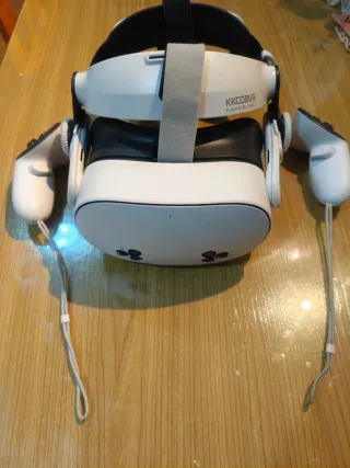 Visore di realtà virtuale con controller. Design in bianco. Include cinghie regolabili e due controller. Include caricabatterie originale con un piccolo urto, funziona perfettamente. Include solo gli accessori delle foto.