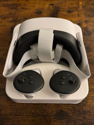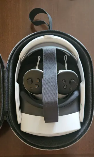 Meta Quest 3S 128GB con i suoi due controller. Include anche la scatola originale, una custodia protettiva e il caricabatterie originale. Tutto funziona perfettamente ed è in perfette condizioni, usato poco.