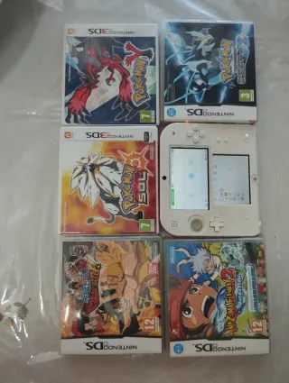Console Nintendo 2DS in bianco, con quattro videogiochi. - Pokémon Nero 2 - Pokémon Sole - Pokémon Luna - Naruto Shippuden: Ultimate Ninja Impact - Inazuma Eleven 2: Tempesta di Fuoco