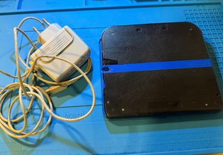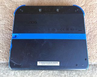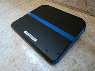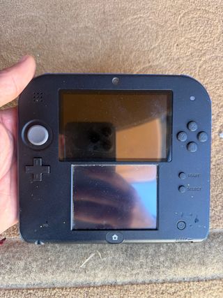 Console Nintendo 2DS in colore nero e blu scuro. Non ha batteria e nemmeno la scocca esterna, funziona per pezzi. Ha lo schermo superiore e inferiore, i pulsanti di controllo direzionale e di azione, i pulsanti START e SELECT.