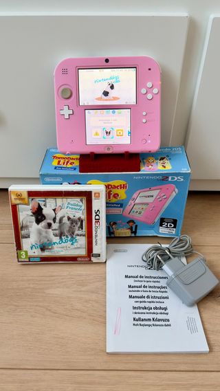 Console portatile Nintendo 2DS in colore rosa, edizione Tomodachi Life, ideale da portare ovunque. Include il gioco Nintendogs + Cats: Bulldog Francese. In condizioni impeccabili. - Include caricabatterie. - Include scatola originale. - Include manuali. Il gioco Tomodachi Life non è incluso.
