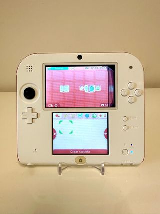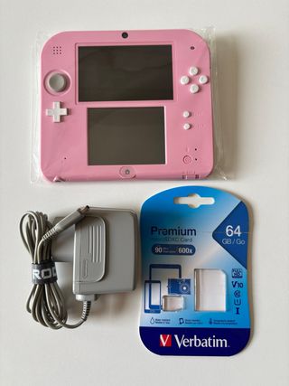 Console Nintendo 2DS in colore rosa, ideale per portare i tuoi giochi ovunque. Include caricabatterie e una scheda di memoria. - Console Nintendo 2DS. - Caricabatterie. - Scheda microSDXC Verbatim da 64 GB. - Speciale con più di 20k di giochi.