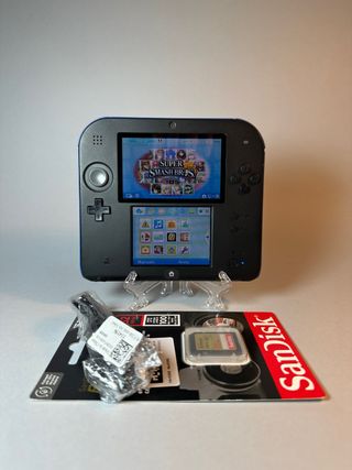 Console portatile Nintendo 2DS con finitura nera e blu. Design ergonomico, schermo touch, CFW, include custodia, cover trasparente, caricabatterie non originale e scheda di memoria da 32 GB.