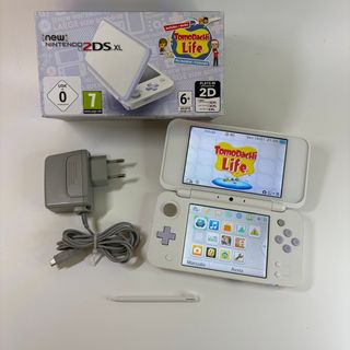Console Nintendo 2DS XL in colore viola e bianco. Include il gioco Tomodachi Life preinstallato. Caricabatterie, stilo e scatola inclusi.