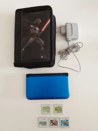 Console portatile Nintendo 3DS XL in colore blu. Include custodia protettiva con design di Star Wars, caricatore e vari giochi. In ottime condizioni, con un graffio sul retro visibile in foto, ma tutto funziona perfettamente. - Custodia con design di Darth Vader. - Caricatore di corrente. - Giochi inclusi: Mario Kart 7, Pacman 2, Yokay watch, Mario Tennis e My foal 3D