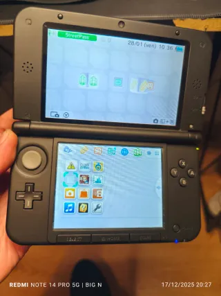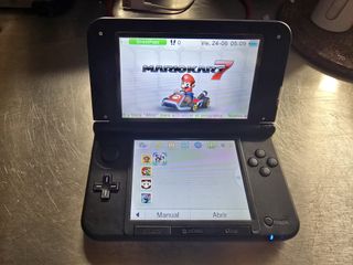 Console Nintendo 3DS XL in colore nero. In buone condizioni: • Alcuni segni estetici sul fondo della custodia • 3D funziona perfettamente • Modificata, permette l'uso di homebrew e backup. Include già alcuni giochi nella memoria • Include caricatore, stilo, custodia e carte 3D • Tutto funziona perfettamente. Manca solo il coperchio del joystick, che costa 3 €. Prezzo: 170 €, leggermente negoziabile • Schermo touch. • Pulsanti di controllo.