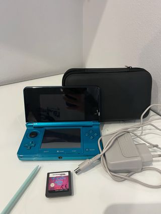 Console Nintendo 3DS in colore blu, ideale per portare i tuoi giochi ovunque. Include custodia protettiva e caricatore. Accessori: custodia di trasporto, caricatore originale, stilo tattile, gioco Pet Hospitals per Nintendo DS.