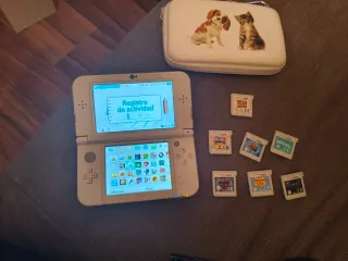 Console portatile Nintendo 3DS XL in bianco e rosa, pronta per ore di divertimento. Include custodia protettiva, caricabatterie originale e dieci giochi (8 per Nintendo 3DS e 2 per Nintendo DS). Giochi inclusi: Animal Crossing, Pokemon Mystery Dungeon, Mario Kart, Nintendogs, Mario Party, Tomodachi. La console è in buone condizioni e funziona perfettamente. L'unico inconveniente è che il pennino a volte non rimane fisso ed esce dallo slot.