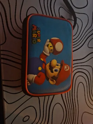 Custodia protettiva per Nintendo 3DS con design di Super Mario. Design blu con Mario e un funghetto. Bordo arancione. Cinturino nero.