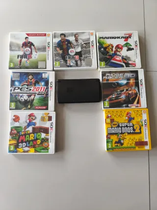 Console Nintendo 3DS in colore nero. Include una custodia protettiva e sette videogiochi. - FIFA 15 - FIFA 13 - PES 2011 - Mario Kart 7 - Ridge Racer 3D - Super Mario 3D Land - New Super Mario Bros. 2 - Le bolle e i graffi sullo schermo sono sul protettore - MANCANTE IL LAPICET - HA IL CARICATORE MA È NECESSARIO TROVARE LA POSIZIONE GIUSTA PER CARICARE E FUNZIONARE CORRETtamente