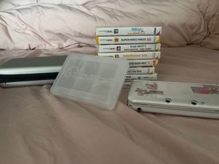 Console Nintendo 3DS in color argento, pronta per il gioco. Include vari giochi e accessori per completare la tua esperienza. Giochi inclusi: Super Mario Maker, Yo-Kai Watch 2, Pokémon Sole, Super Mario Bros. 2, Kirby: Star Rush. Include anche una custodia di trasporto argentata e un astuccio per i cartuccioni dei giochi.