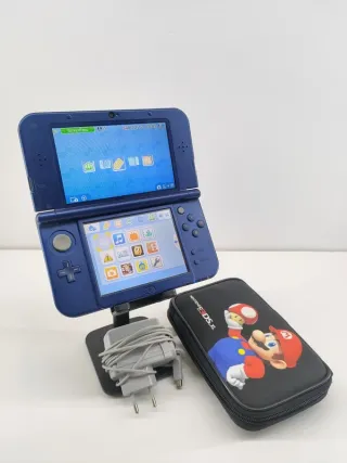 Console portatile Nintendo 3DS XL in colore blu. - Schermo superiore 3D. - Tasti di controllo direzionale e analogico. - Fotocamera frontale e posteriore. I giochi sono Pokémon Luna, F1 2011, Fifa 15, Mario Tennis Open e una scheda con più di 40 giochi.