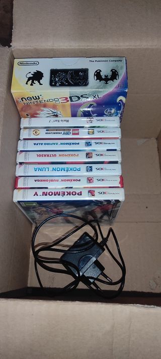 Edizione limitata 'Sole e Luna' di Nintendo 3DS XL. Schermo IPS. Presenta segni d'uso, ma è ben curata per la collezione. Piccoli segni sul retro inferiore e sulla cerniera interna. Inclusi: scheda microSDHC da 16GB, caricabatterie originale e stilo. Opzionale: Pokémon Ultrasole e Ultraluna + Steelbook per 550€.