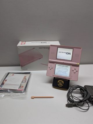 Console Nintendo DS Lite di colore rosa, completa di scatola e accessori. - Console Nintendo DS Lite - Scatola originale - Manuali e fogli informativi - Cavo di alimentazione - Stylus di ricambio Manca il cartoncino interno