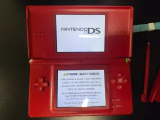 Console portatile Nintendo DS Lite di colore rosso. - Schermo superiore e inferiore. - Pulsanti direzionali e pulsanti azione. - Slot per cartucce di gioco.