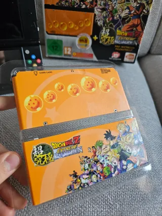 New Nintendo 3DS edizione speciale Dragonball completo di scatola. Console in discrete condizioni estetiche, gli schermi presentano soltanto qualche graffio molto leggero, mentre la scocca presenta segni di usura visibili in foto. La scatola è compresa di inserti di cartone e manuale ed è in buone condizioni generali. Da segnalare che la fotocamera esterna della console NON è funzionante. Sulla console sono pre-installati Dragonball Z 2 e Dragonball Z Extreme Butoden. La scocca di Dragonball presenta graffi sulla superficie.